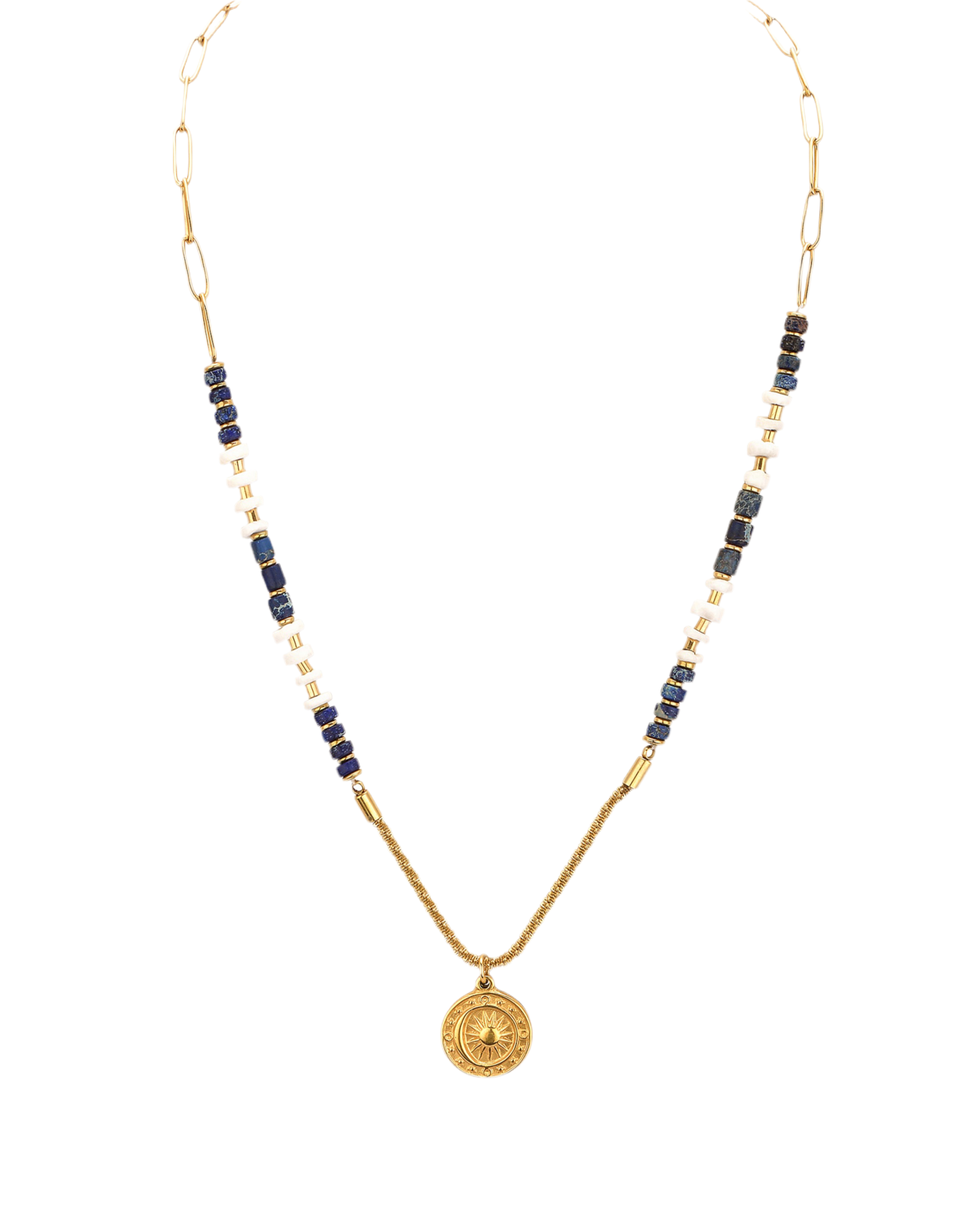 The 18K gold-plated chain is complemented by carefully arranged beads, creating a unique statement piece that blends modern trends with timeless aesthetics. Whether you're embracing your wanderlust or elevating your everyday look, this necklace is the perfect finishing touch.