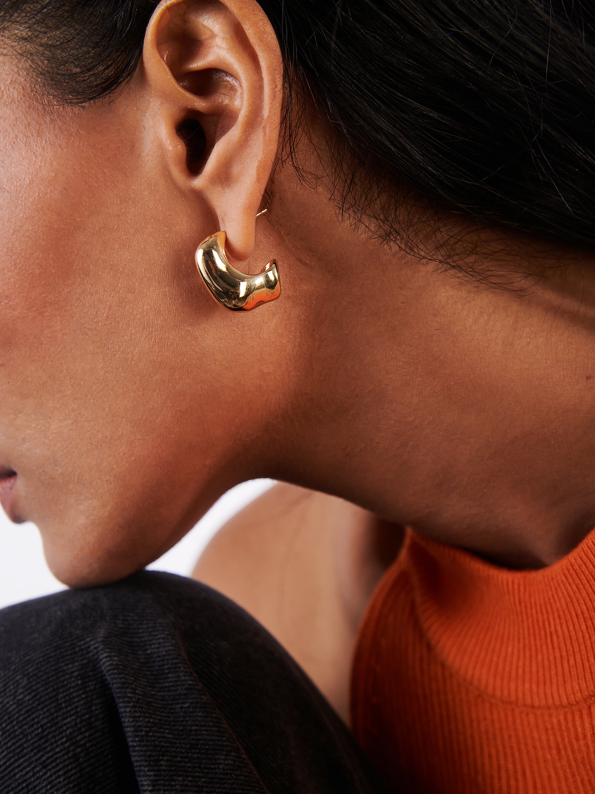 Crafted with 18K gold plating, their polished yet sculptural look adds the perfect touch of sophistication for both everyday wear and statement styling. Whether paired with minimal jewelry or layered for a bold effect, these earrings are designed for those who love structured yet fluid aesthetics.