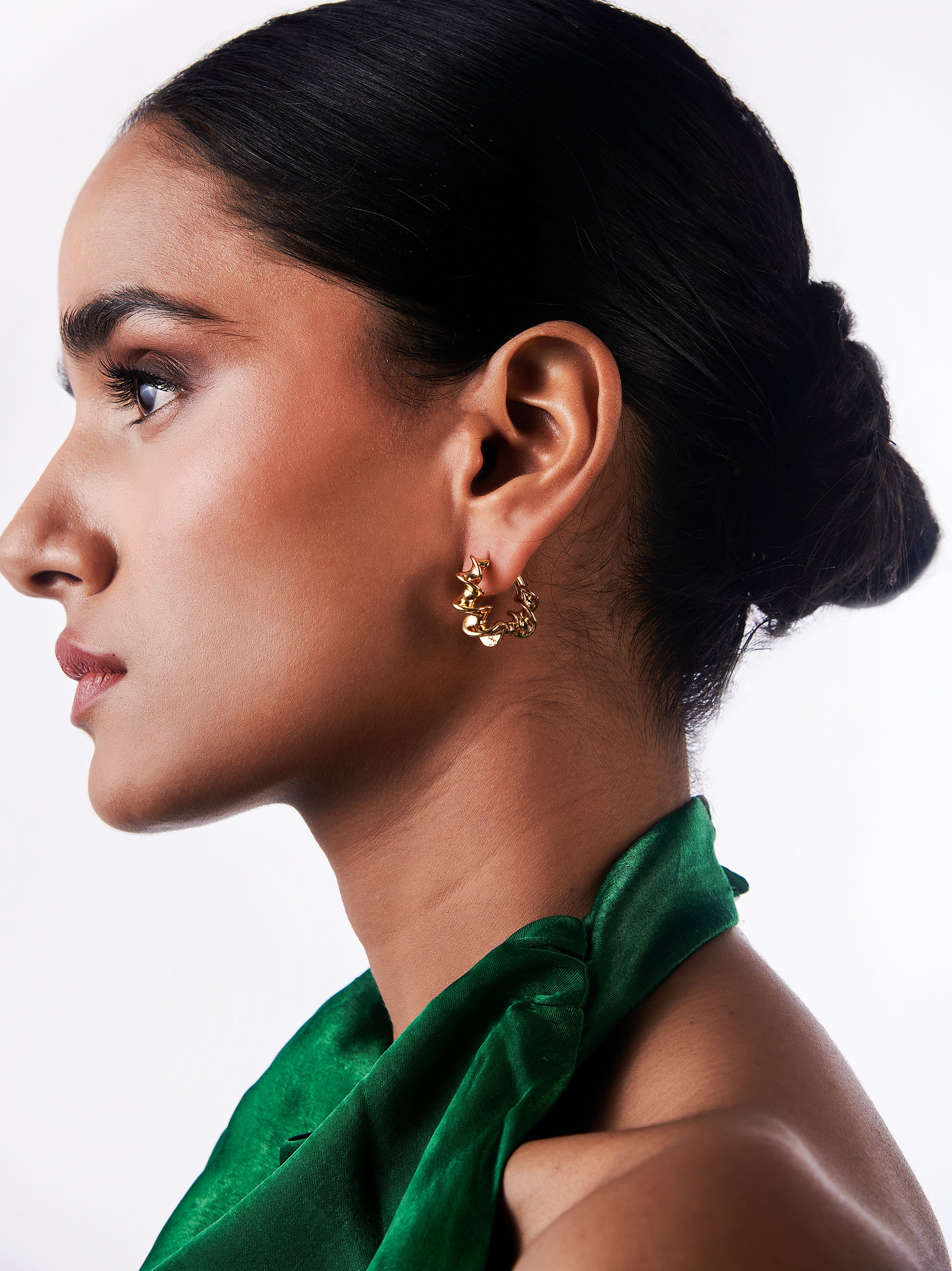 Make a bold statement with the Serpentine Spiral Hoop Earrings, a unique twist on classic hoops. Featuring a fluid, twisted spiral design, these earrings bring an artistic, sculptural element to any look, perfect for those who love elevated minimalism with a touch of drama.