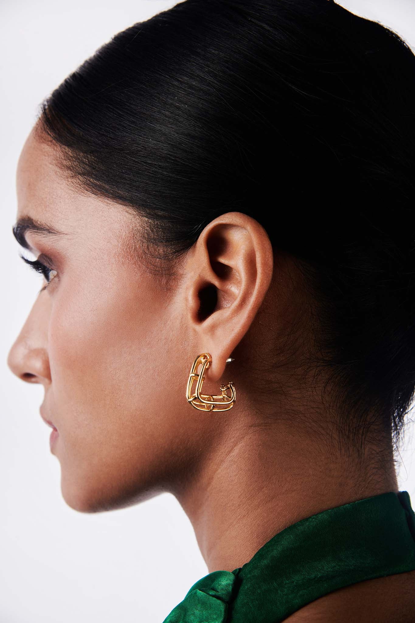 Crafted with 18K gold plating, their sculptural yet minimal form makes them the perfect accessory for everyday styling or statement layering. Elevate your look with these artful, fashion-forward earrings that blend sophistication with an urban-chic vibe.